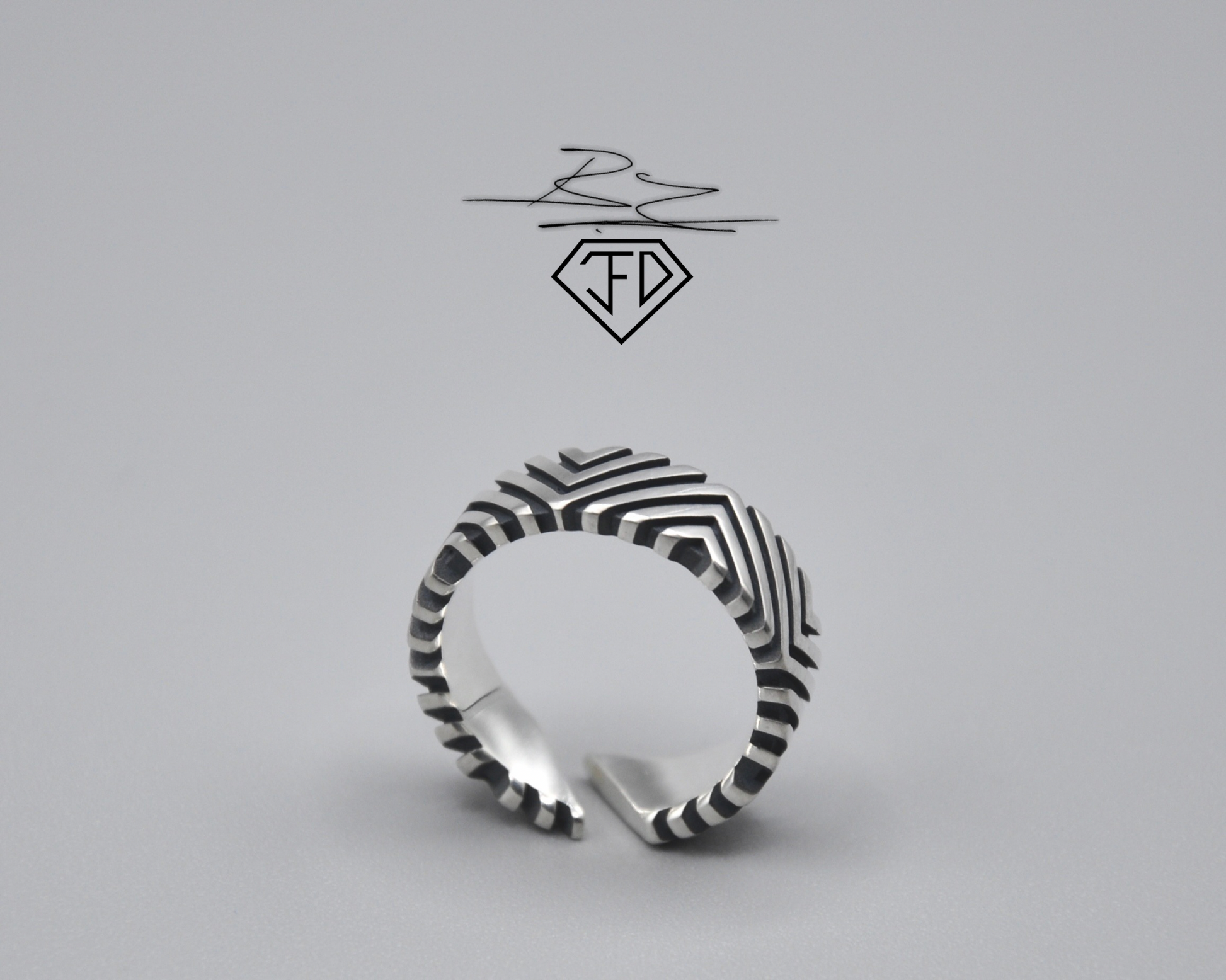 A ring that adapts to your finger, designed open, it fits any size while keeping perfect proportions. Born from the golden ratio, it was carefully realized in 3D and crafted in close collaboration with Germany’s first Argentium silver foundry JFD JEWELRY. Every step tells a story of craftsmanship: from 3D printing to creating the plaster mold, and finally casting under vacuum. Back in my workshop near Frankfurt, the ring was meticulously refined, oxidized and polished. The result: a unique piece of jewelry that is allergen-friendly, striking in design, and instantly wearable thanks to its open structure.