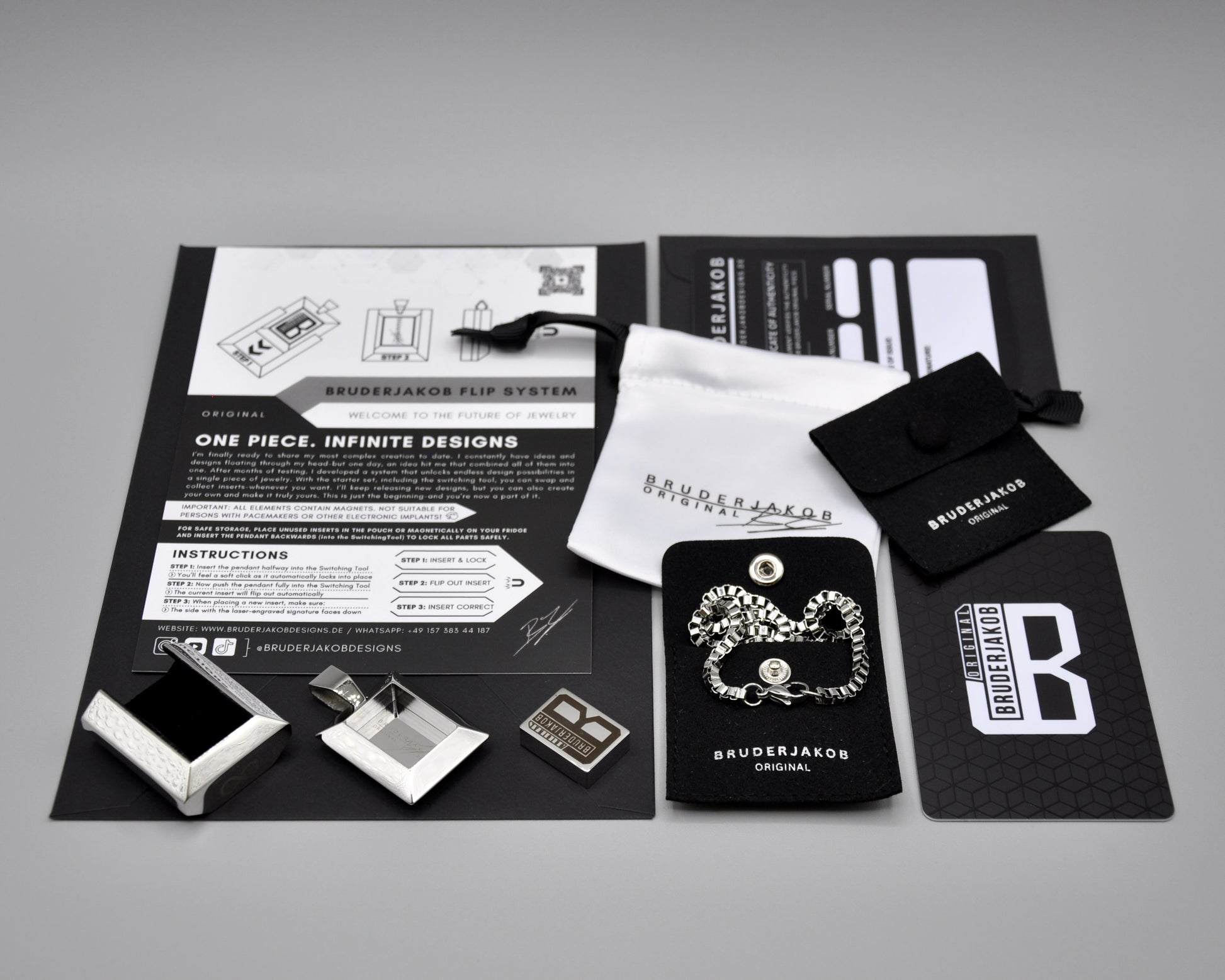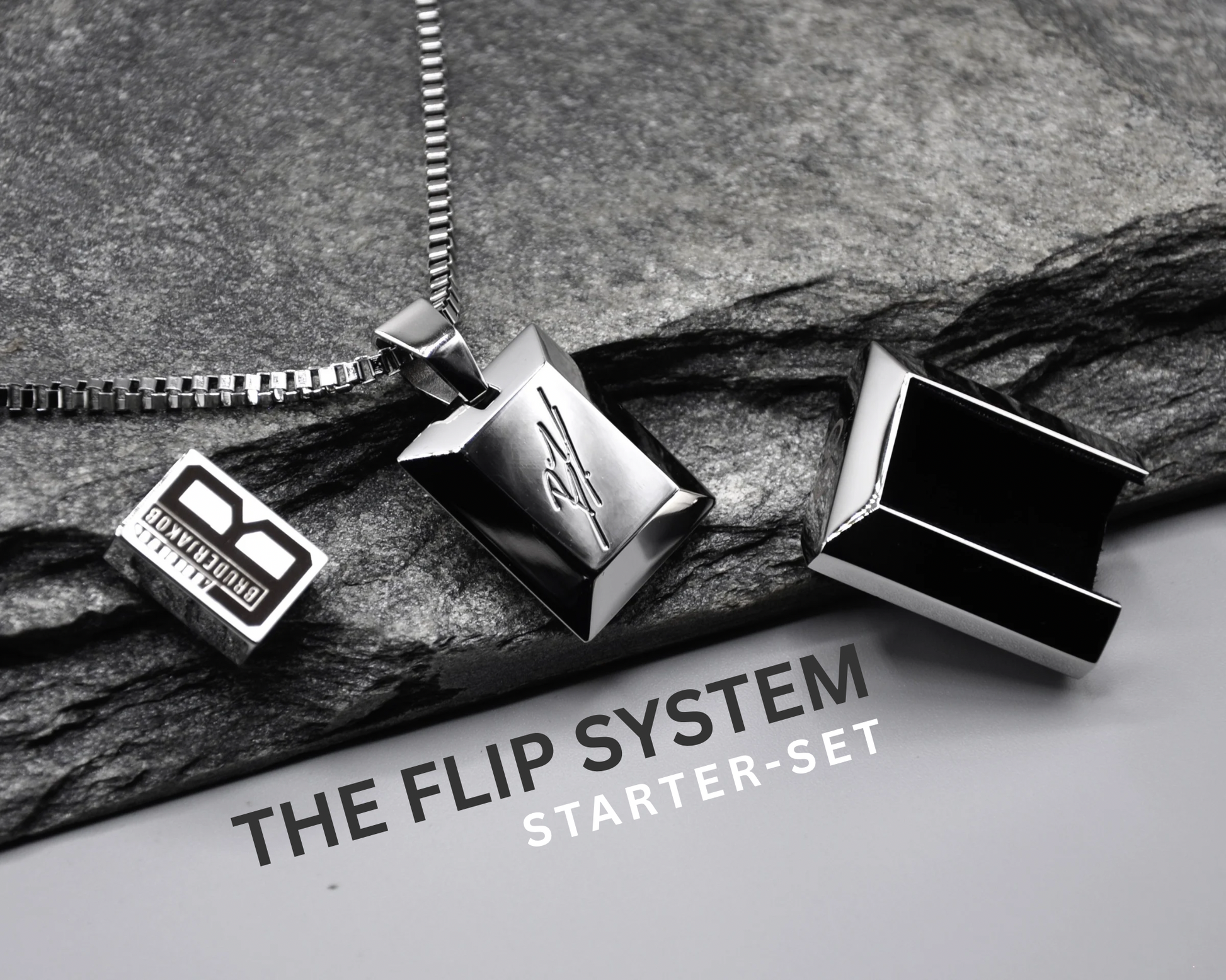 The Starter-Set includes everything you need to begin your Flip System journey. Inside you’ll find a stainless steel chain, a pendant, one engraved logo insert, the Switching Tool, and an instruction manual. With this set, you only need to buy once – from here, you can collect and swap as many designs as you like.