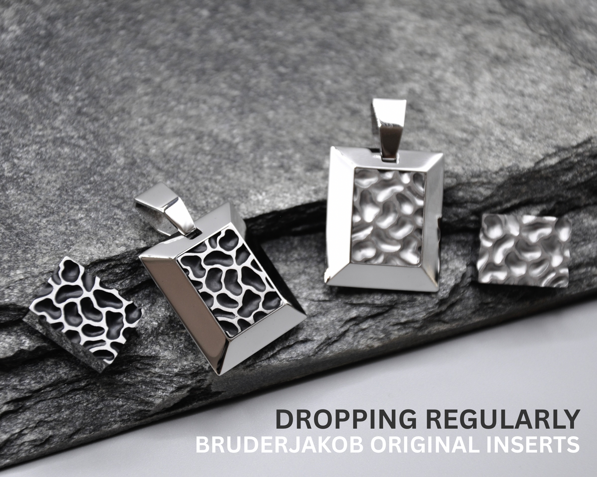New BRUDERJAKOB Original Inserts are dropping regularly, giving you fresh ways to customize your look. You can also create your own by uploading a design for a CUSTOM ENGRAVED INSERT or a CUSTOM PICTURE INSERT directly on my website.